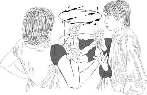 Основные виды усилия в тайцзи-цюань хорошо виды на примере базового упражнения туйшоу («липкие руки»). Партнеры встают друг напротив друга, поднимают правую руку ладонью к себе на уровне плеч и касаются друг друга тыльной стороной запястья – легко, но в то же время не позволяя оппоненту «продавить» себя. В ответ на усилие другой стороны рука должна как бы пружинить – это усилие покоя «пэн». Затем один из партнеров разворачивает руку ладонью к оппоненту и, атакуя, начинает давить на его запястье. Сила, которую он вкладывает в это движение, направлена в грудь оппонента – это толкающее усилие «цзи» (точки 2 и 4 на схеме). Вместо того чтобы пытаться сбить или оттолкнуть нападающего, защищающийся поддается давлению и, помогая себе корпусом, отводит руку противника по косой, как бы пропуская ее мимо себя. При этом он использует усилие «люй», направленное назад и вбок. Однако атакующий не оставляет своих попыток и продолжает давить (точки 1 и 3 на схеме). Чтобы нейтрализовать давление, защищающийся использует усилие погружения «ань», направленное вниз и вбок: он немного присаживается и уводит руку нападающего вниз, затем в сторону, после чего сам переходит к атаке. Повторяя упражнение, партнеры постоянно меняются ролями.
