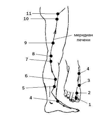 Наружный ход меридиана печени начинается на внутренней стороне первого пальца стопы, проходит по внутренней поверхности стопы, голени, бедра, выходит на среднюю линию живота и оттуда следует к 6-му межреберному промежутку.