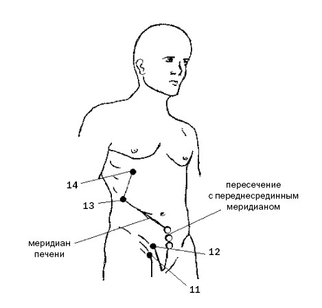 12. Цзи-май («пульсирующий сосуд») расположена на 2,5 цуня кнаружи от нижнего края лобкового симфиза (то есть расположенного по срединной линии вертикального соединения лонных костей). Показания к использованию: боли в нижней части живота, боли в половом члене у мужчин, боли при грыже; гинекологические болезни; расстройства мочеиспускания; боли по медиальной (внутренней) поверхности бедра.