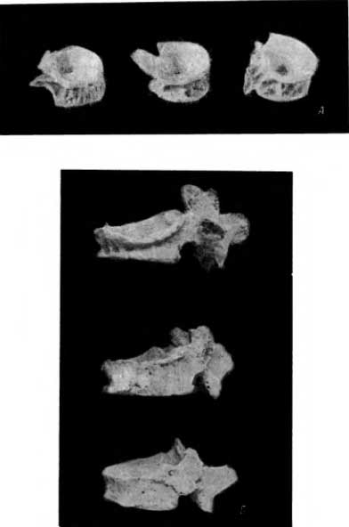 Тела позвонков рыб имеют конусовидные углубления на обращенных друг к другу поверхностях (рис. 84, А). Эти конусовидные углубления в позвонке отделены друг от друга очень незначительным количеством хряща. Соответственно форме тел позвонков диски у рыб являются образованиями, имеющими не плоские поверхности, а вытянутые, с конусовидными выступами, заполняющими вдавления в телах позвонков.