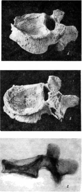 Рис. 85. Рыбья деформация позвонков. А — II поясничный позвонок; Б — III поясничный позвонок; В — рентгенограмма III поясничного позвонка, тело которого деформировано по типу рыбьего позвонка.