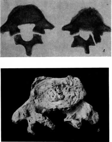 В Саркеле был найден скелет пожилой женщины; ее позвонки были деформированы по типу рыбьих позвонков. Особенно резко были деформированы тела II, III и IV поясничных позвонков (рис. 84, Б; 85, А, Б, Б).
