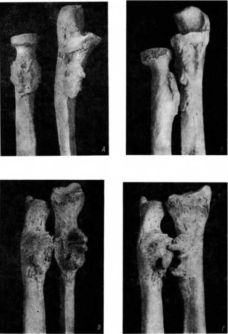 Рис. 87. А — мощные костные разрастания на бугристостях обеих костей предплечья, возникшие под влиянием продолжительного давления патологически увеличенных слизистых сумок двуглавой и трехглавой мышц плеча; Б — соотношения между обеими костями предплечья в области мощных реактивных костных разрастаний; В — мощные костные разрастания в травмированных участках костей предплечья, образовавшие неоартроз; Г — неоартроз между костями предплечья.