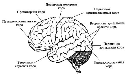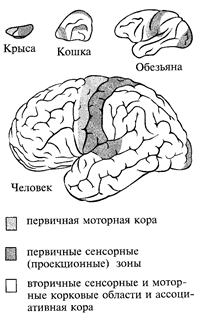 Рис. 46. Проекционные, ассоциативные и моторные области коры больших полушарий