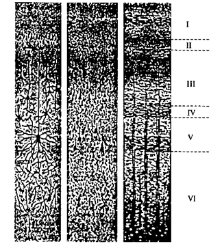 Рис. 48. Слои коры. Слева нейроны с отростками (окраска по Гольджи), в центре — тела нейронов разного типа и размера (окраска по Нисслю), справа — волокнистые структуры (окраска, выявляющая миелиновую оболочку)