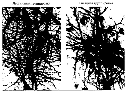Кроме микроансамблей выделены более сложные группировки (лестничные, гнездные), включающие большое количество нейронов разных типов, и разветвленные базальные дендриты (рис. 49). Такие ансамбли чаще встречаются в ассоциативных областях и являются структурной основой более сложной обработки информации.