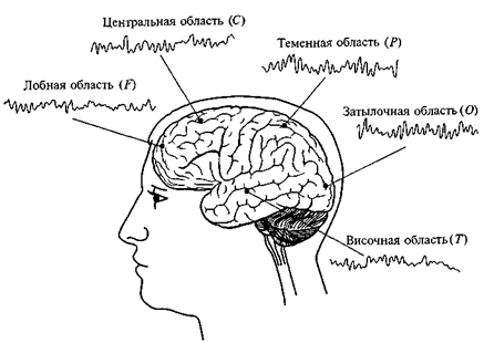 Электроэнцефалография. В настоящее время наиболее распространенным и адекватным для изучения функциональной организации мозга является метод регистрации электроэнцефалограммы (ЭЭГ) — суммарной биоэлектрической активности, отводимой с поверхности головы. Многоканальная запись ЭЭГ в различных отведениях позволяет одновременно регистрировать электрическую активность функционально различных областей коры (рис. 51).