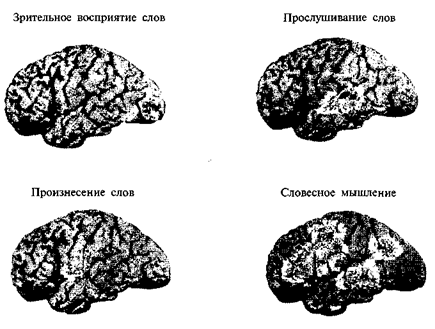Рис. 53. Компьютерная томограмма мозга при решении различных вербальных задач
