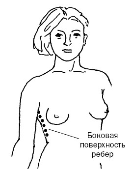 3. Следующая зона – боковая поверхность ребер ниже подмышечной впадины (рис. 3, а). Для женщин эта зона особенно важна, поскольку на боковой поверхности грудной клетки расположены лимфатические узлы, связанные с молочной железой. Массаж этой зоны предупреждает образование доброкачественных опухолей молочной железы. Энергично простукиваем левой рукой правую боковую поверхность. Затем беремся рукой за подмышечную впадину, проминаем ее и нежно простукиваем. Массаж производим на каждой боковой поверхностях в течение 2 минут.