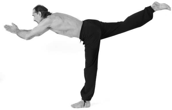 Медленно поднимите одну ногу и отведите ее назад. Туловище при этом наклоняется вперед.