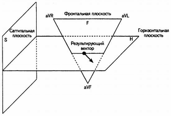 Результирующий вектор возбуждения желудочков представляет собой суммационный вектор возбуждения: межжелудочковой перегородки, верхушки и основания сердца. Он имеет определенную направленность в трехмерном пространстве — во фронтальной, горизонтальной и сагиттальной плоскостях. В каждой из них результирующий вектор имеет свою проекцию, но более всего нас интересует его проекция во фронтальной плоскости.