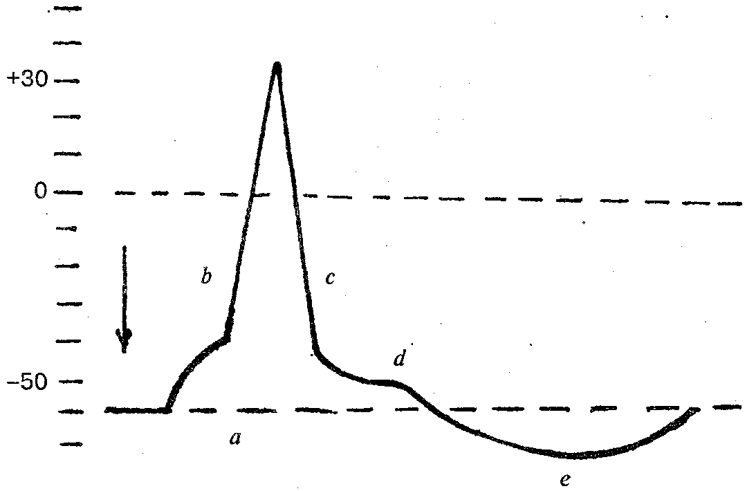 а — местные колебания мембранного потенциала; b — восходящая часть пика потенциала действия (фаза деполяризации); с — нисходящая часть пика потенциала действия (фаза реполяризации); d — отрицательный следовый потенциал; е — положительный следовый потенциал. Стрелкой указан момент нанесения раздражения