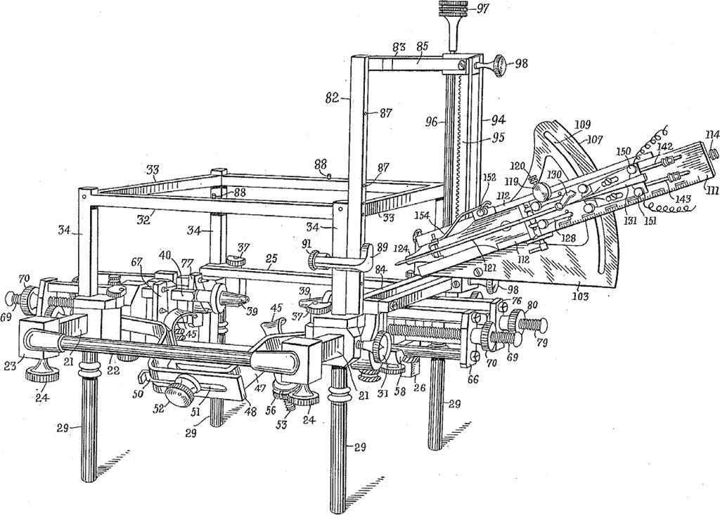 Рис. 27. Первая стереотаксическая рама. Аппарат был запатентован американцем Робертом Кларком в 1914 году. Череп фиксируется в центре рамы при помощи дужек и «удила». Зонд в правой части использовался для проведения операций. Патент # US1093112-8.