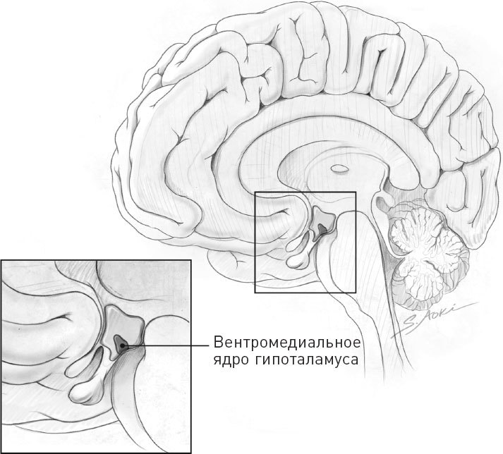 Ученые стали считать вентромедиальное ядро гипоталамуса центром сытости. Животные с поврежденным ядром теряли возможность чувствовать насыщение и быстро накапливали лишний жир. Угнетенное состояние этого отдела мозга погубило Элизу Мозер, пациентов Флёриха и крыс Гетерингтона и Бробека.[93] Ученые обнаружили центр сытости, но им еще предстояло выяснить, как он работает.