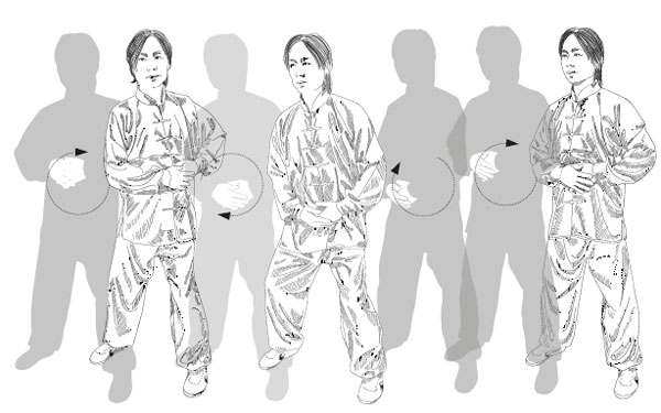 1. Описание движения: принять стойку «Столбовое стояние» (движение № 1), положить обе ладони на живот и начать легкий массаж живота, описывая ими круговые движения по часовой стрелке. Корпусом помогать движению рук: немного присесть, когда руки идут вниз, и выйти из приседа, когда они идут вверх.