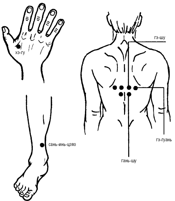 1. ГАНЬ-ШУ (V-8) находится на 1,5 цуня от срединной линии спины, между Д8_9/1 по 1-й линии спины (точка печени).