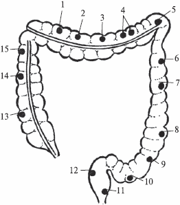 Рефлексогенные зоны толстого кишечника: 1 – желчный пузырь; 2 – сердце; 3 – легкие; 4 – желудок; 5 – селезенка; 6-поджелудочная железа; 7 – надпочечники; 8 – почки; 9 – яичник; 10 – мочевой пузырь; 11 – простата; 12 – половые органы; 13 – тимус (зобная железа); 14 – щитовидная железа; 15 – печень