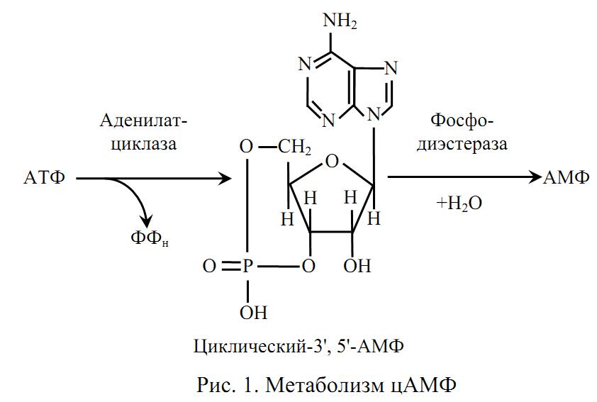Главным вторым посредником является цАМФ (рис. 1). Большинство гормонов действует через него. Другие посредники, действуя через свои протеинкиназы, могут изменять содержание цАМФ в клетке путём повышения или снижения активности ферментов, синтезирующих или разрушающих цАМФ.