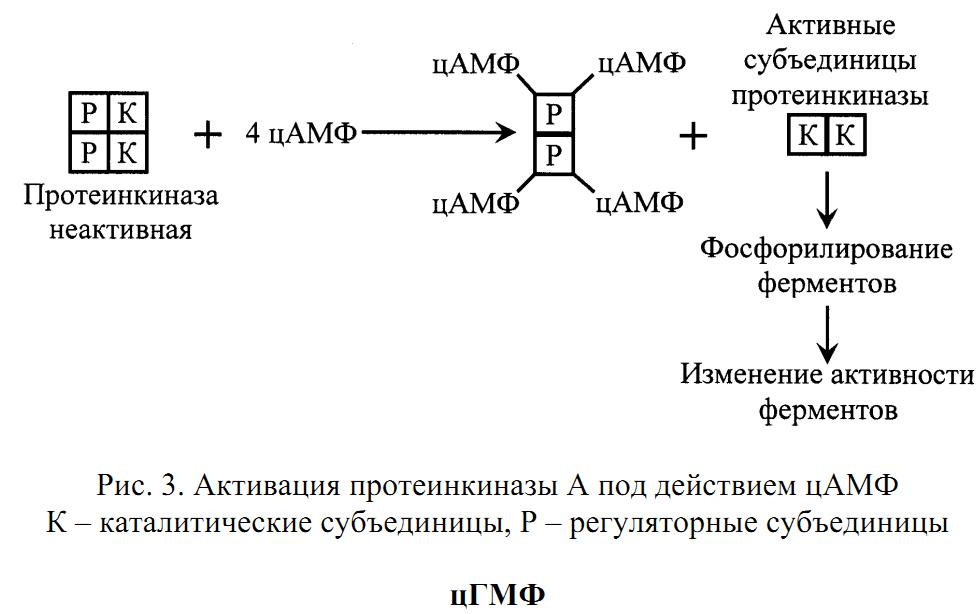 Протеинкиназа состоит из 4 субъединиц (тетрамер), две из которых являются регуляторными, а две – каталитическими (рис. 3. . В таком виде протеинкиназа неактивна. При связывании протеинкиназой 4 молекул цАМФ происходит отсоединение (диссоциация) каталитических субъединиц, которые фосфорилируют белки (ферменты), изменяя их активность.