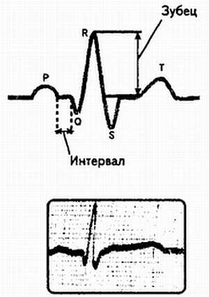 Прохождение импульса по проводящей системе сердца графически записывается по вертикали в виде пиков — подъемов и спадов кривой линии. Эти пики принято называть зубцами электрокардиограммы и обозначать латинскими буквами Р, Q, R, S и Т.