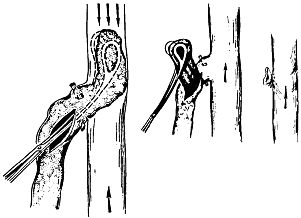 Тромбэктомия из глубоких вен с помощью катетера Фогарти находит ограниченное применение в связи с большой частотой повторных тромбозов и тромбоэмболии. Применение ее возможно лишь в первое время после возникновения тромбоза, пока не произошла плотная фиксация тромба к стенкам вены (рис. 3.5).
