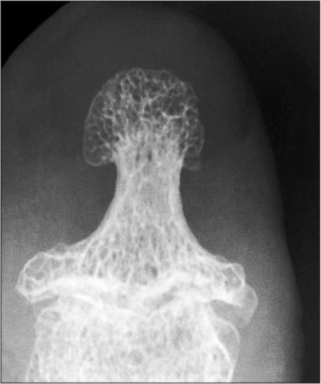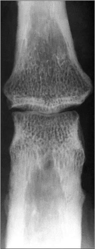Рис. 10. Рентгенограмма дистального межфалангового сустава III пальца больного IV стадией первичного остеоартроза (5-кратное увеличение рентгеновского изображения) (начало):