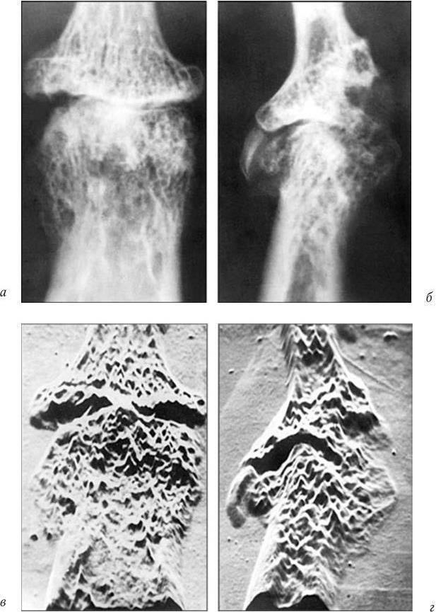 а, в — прямая проекция; б, г — боковая проекция. Пояснения в тексте Рентгенограмма дистального межфалангового сустава III пальца больного IV стадией первичного остеоартроза (5-кратное увеличение рентгеновского изображения) (окончание):