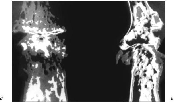Обработка изображения на ЭВМ методом амплитудного рельефа: четко представлена деформация костных балок (новообразованная костная ткань накладывается холмами на поверхность кости), толстый слой неравномерного субхондрального склероза, мелкие кисты с костной стенкой, не обнаруженные даже при прямом многократном увеличении, и видоизмененная полость сустава (см. рис. 10, в); значительная деструкция костных балок эпифизов, склероз подхрящевых отделов, слоистая структура остеофита и трансформированная полость сустава (см. рис. 10, г).