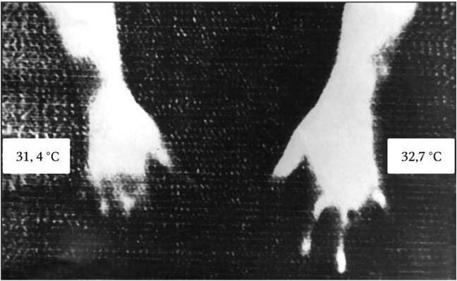 Значительная термоасимметрия как по данным электротермии (у здоровых людей до 0,4 °C), так и на теплограмме. Резко выраженный симптом термоампутации пальцев справа на уровне суставов запястья. Слева — на уровне пястно-фаланговых суставов в IV и V пальцах