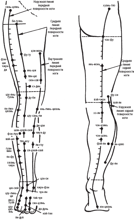 На нижних конечностях расположены точки по линиям, проходящим по передней, задней и внутренней поверхностям: