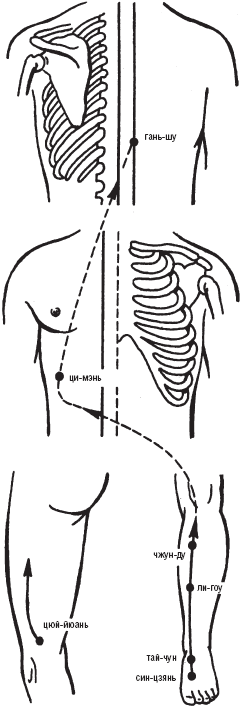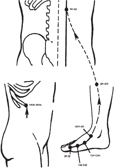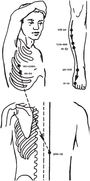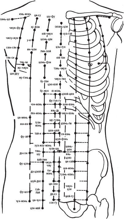 • По 3-й боковой линии живота – ци-мэнь, да-хэн (при заболеваниях печени, кишечника, запорах, язвенной болезни желудка и двенадцатиперстной кишки)
