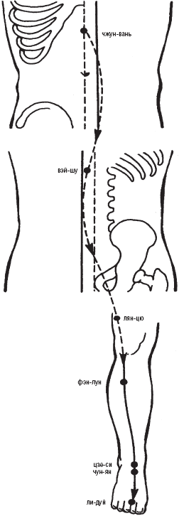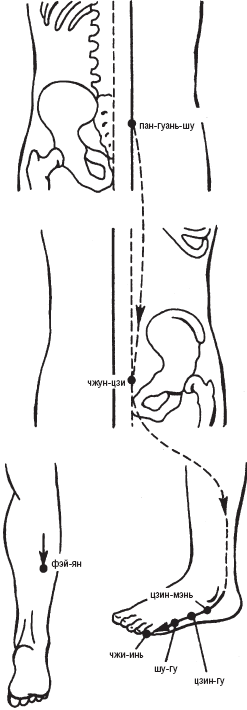 • По средней линии задней поверхности ноги – чэн-шань, нэй-чжун, чэн-фу, хуань-тяо, хэ-ян (при судорогах в икроножной мышце, заболеваниях женских половых органов, геморрое, неукротимой рвоте, пояснично-крестцовом радикулите, ишиасе, заболевании малоберцового нерва, при оказании скорой медицинской помощи при обмороке.