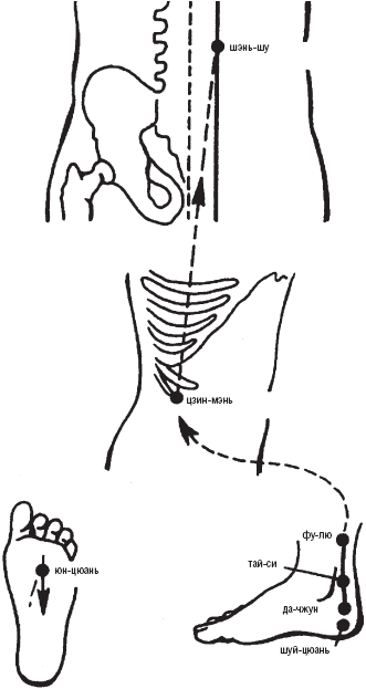 • По средней линии внутренней поверхности ноги – сань-инь-цзяо, инь-бао (при судорогах мышц нижних конечностей, заболеваниях половых органов, расстройствах сна, климаксе, импотенции, эндокринно-гормональных дисфункциях, спазме икроножных мышц, кишечной колике).