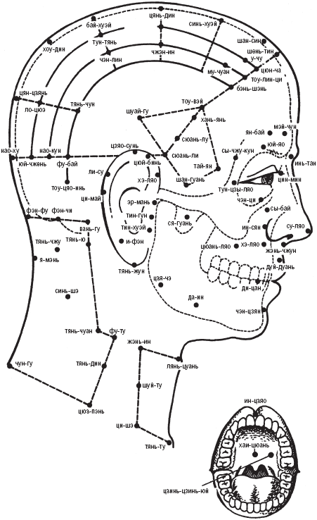 • В области глаза – ян-бай, сы-чжу-кун, тун-цзы-ляо, чэн-ци, сы-бай, инь-тан (все точки чаще всего используются при воспалительных заболеваниях носа, невралгиях тройничного и лицевого нервов, при тиках, контрактурах мимических мышц).