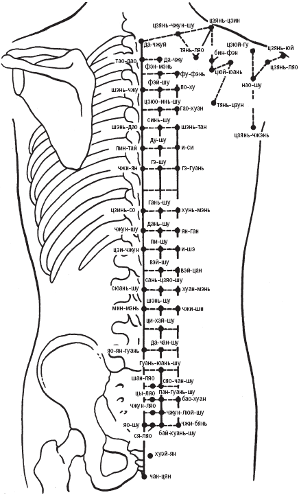 • По 1-й боковой линии спины – фэй-шу, синь-шу, гэ-шу, гань-шу, дань-шу, пи-шу, вэй-шу, шэнь-шу, да-чан-шу, сяо-чан-шу, пан-гу-ан-шу и все точки области отверстия крестца, ба-ляо (шан-ляо, цы-ляо, чжун-ляо, ся-ляо). Данные разновидности точек имеют сегментарно-органную направленность действия (легкие, сердце, почки и др.).