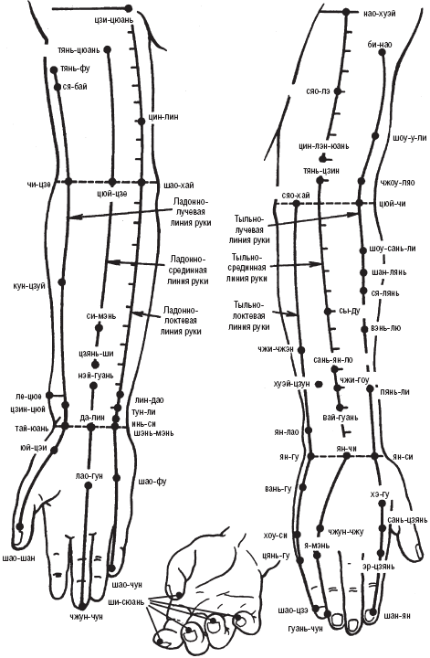 • По ладонно-лучевой линии – юн-цзи, тай-юань, ле-цюе, чи-цзе (при невритах, невралгиях лицевого и тройничного нервов, гемиплегии, тонзиллите, бронхиальной астме, эмфиземе легких, болях в шее и предплечье, межреберной невралгии, головной боли и при нарушении функций нервной системы).