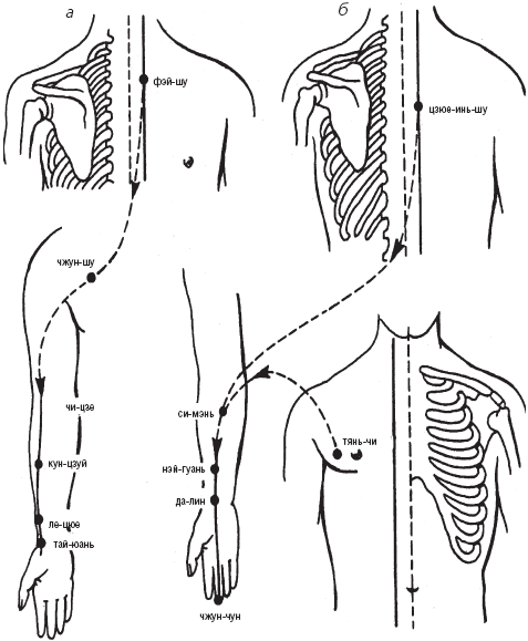 4. Регионарные точки – находятся в зоне проекции внутренних органов на кожу – чжун-фу (лег кие), чжун-вань (желудок), ци-мэнь (печень), цзюй-цюе (сердце), тянь-чи (управитель сердца).
