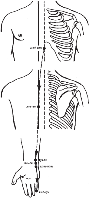 • По ладонно-локтевой линии – шэнь-мэнь, шао-хай (наиболее эффективны при заболеваниях сердца, неврозах, психических расстройствах, невритах и невралгиях локтевого, срединного нервов), шао-чун (при боли в сердце, за грудиной).