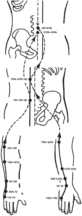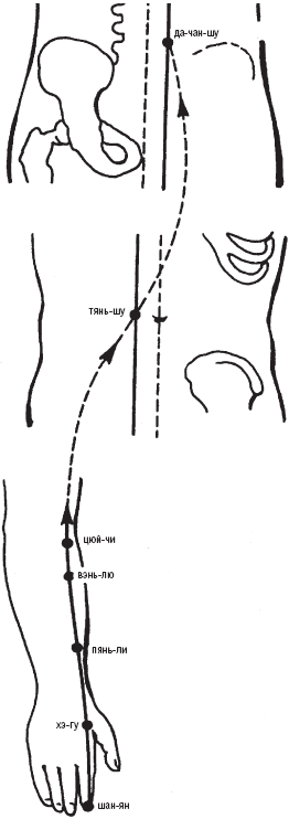 • По тыльно-лучевой линии – шан-ян, хэ-гу, шоу-сань-ли, цюй-чи (при двигательных и чувствительных нарушениях верхних конечностей, миозите, артрите плечевого сустава, заболеваниях кишечника, органов дыхания, лимфадените).