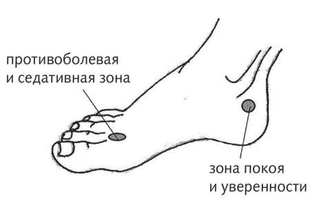 На верхней стороне стопы, между 1-м и 2-м пальцами (точнее между их вторыми фаланговыми суставами) расположена зона, которая считается седативной или успокаивающей зоной большого канала печени (рис. 43). А, как известно, психологическое состояние во многом зависит от состояния печени. После легкого массажа прогрейте зону мокса-сигаретой в течение 15 минут и прикрепите аппликацию из семян мака, льна или тмина. Воздействие на эту зону облегчает головную боль, снимает дрожь и лихорадку.