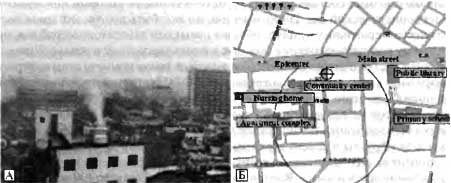 Рис. 1.57. Обстоятельства инцидента в Камедо. А. Облако, выброшенное из башни охлаждения офисного здания секты «Аум-Синрикё» (фотография сделана 01.07.1993 г. сотрудниками Department of Environment, Kotoward). Б. Зона риска инфицирования людей возбудителем сибирской язвы, очерченная по жалобам жителей района на отвратительный запах. Ветер в пределах 2–4 м/с. Менялся в течение утра с северного на северо-восточный. Ранним утром прошел небольшой дождь. По Н. Takahashi et al. (2004)