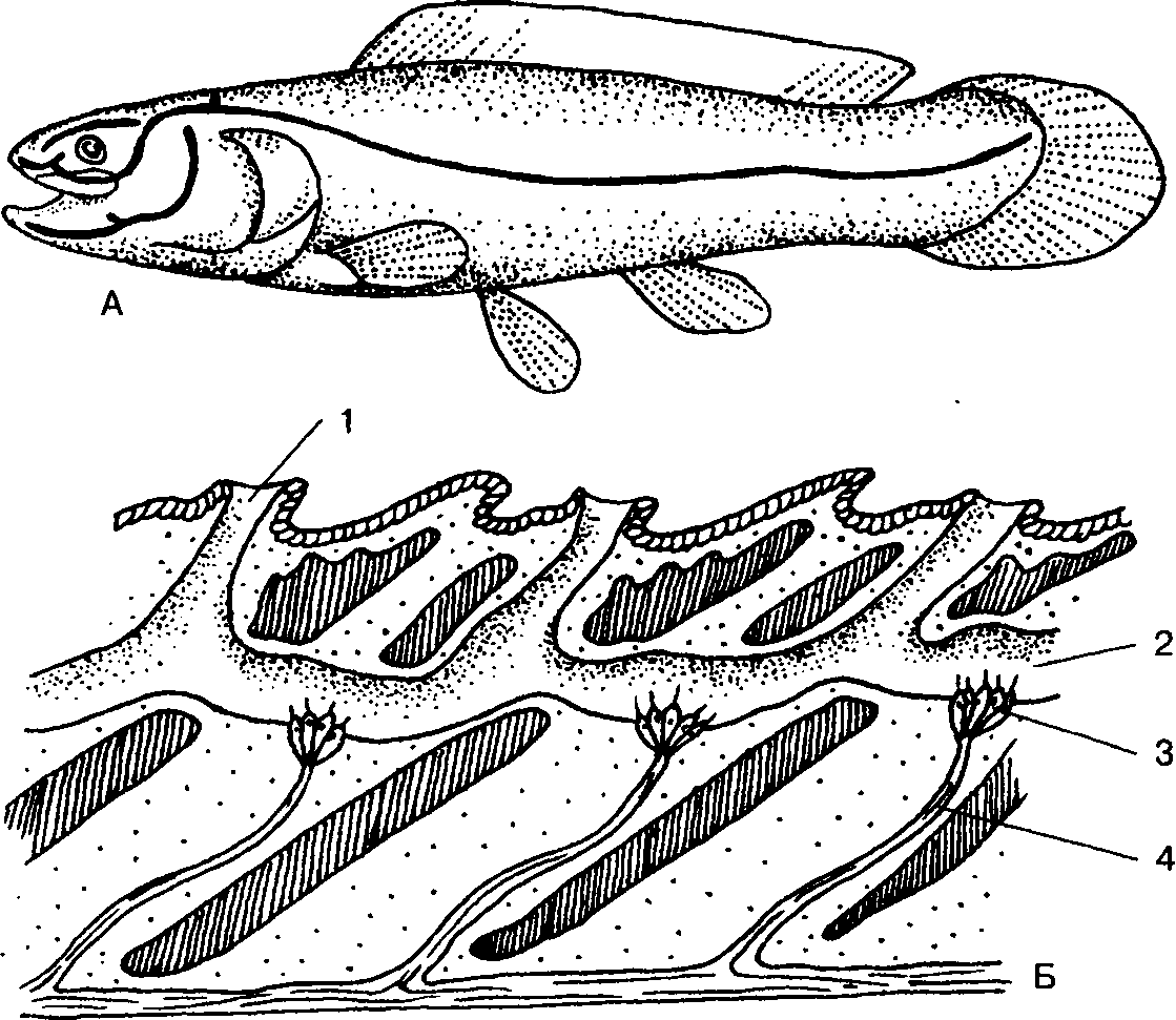 Боковая линия: А – расположение на теле рыбы; Б – срез кожи при увеличении; 1 – пора на поверхности тела; 2 – канал боковой линии; 3 – чувствительные клетки; 4 – нервы