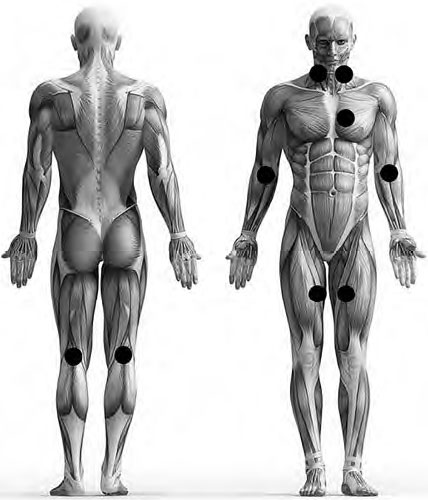 Для профилактики и лечения начальных стадий венозной недостаточности рекомендуется использовать методику чрескожного полизонального последовательного лазерного воздействия на сосудисто-нервные сплетения (рис. 23). Характеристики лазерного излучения: частота – 80–150 Гц, мощность – 25 мВт; время экспозиции на 1 зону – от 30 с до 1,5 мин. Длительность профилактического курса – 7–9 процедур, проводимых через день. Длительность курса лечения – 10–15 ежедневных процедур. Профилактические и лечебные курсы необходимо повторять каждые 1,5–2 месяца.