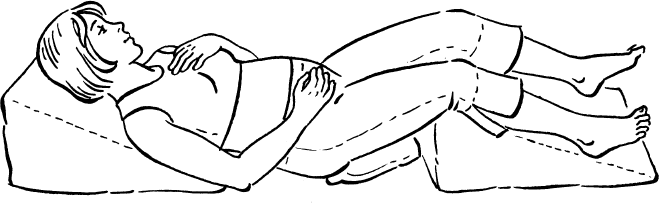 Исходное положение: лежа на спине, ноги согнуты в коленях (рис. 101). Положите одну руку на живот чуть ниже пупка и постарайтесь почувствовать естественный ритм своего дыхания. Расслабьтесь – так вы почувствуете, что живот при вдохе поднимается и при выдохе опускается.