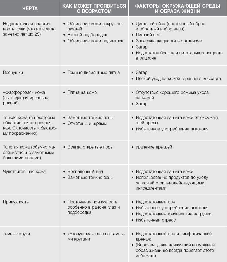 Удивительно, как быстро можно придумать способ улучшения состояния кожи, если присмотреться к унаследованным чертам. Я разработала очень простую таблицу, которая поможет вам с этим упражнением. Это список главных черт, которые вам нужно искать в себе. Впрочем, есть и черты, не попавшие в этот список – их вам уже предстоит найти самим.
