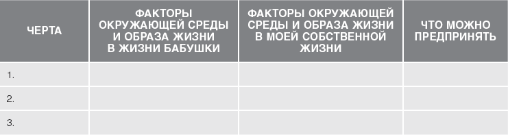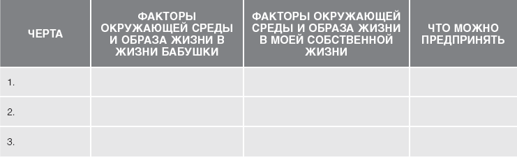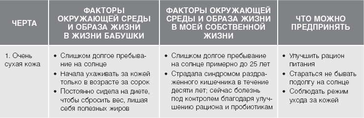 Начните заполнение таблицы с очевидных вещей, которые вы знаете. Если вы не очень понимаете, какие факторы окружающей среды или образа жизни повлияли на то или иное свойство и что нужно предпринять, чтобы с ним справиться, не беспокойтесь: скорее всего, вы найдете ответ, прочитав оставшуюся часть книги. Можете вернуться к этим таблицам после прочтения книги или заполнять их по мере чтения.