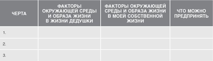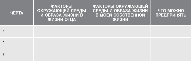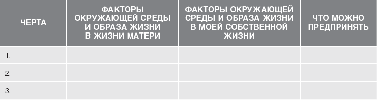 Если вы приемный ребенок или по какой-то иной причине не знаете своих родителей, просто выпишите все, что кажется вам генетической чертой, укажите все факторы окружающей среды, которые могут как-то влиять на проявление этих черт, а потом, прочитав всю книгу, вернитесь обратно к таблице и составьте список возможных действий, которые можно предпринять.