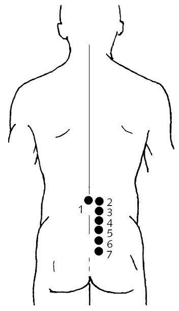 4. Да-чан-шу («точка спины толстого кишечника») расположена на 1,5 цуня кнаружи от места под остистым отростком 4-го поясничного позвонка. Терапия точки показана при нарушении мочеиспускания.