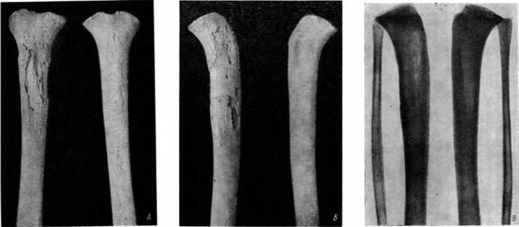 На мацерированной большеберцовой кости (слева) видна деструкция в области проксимального метафиза и верхней трети диафиза. Поверхностный слой кортикального вещества на довольно значительном протяжении разрушен. Видны небольших размеров свищевые ходы (рис. 29, Б), а местами — частично окостеневшие неровные периостальные наслоения.