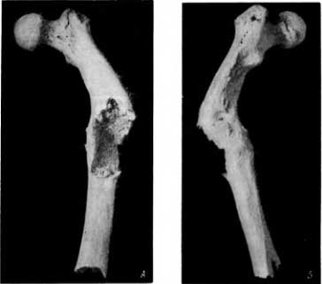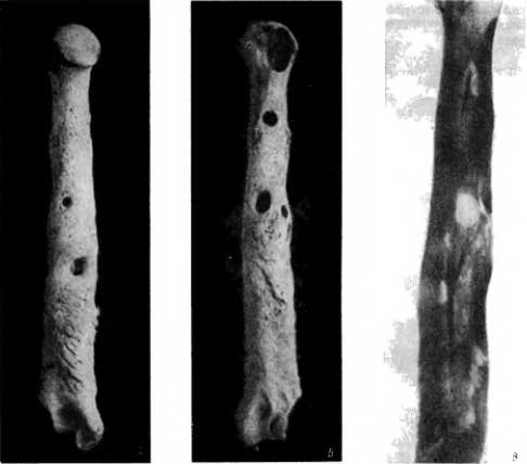 Остеомиелитические изменения обнаружены на костях животных, живших в отдаленнейшие эпохи, они найдены также и на костях людей из старых погребений (см. главу I, 2).